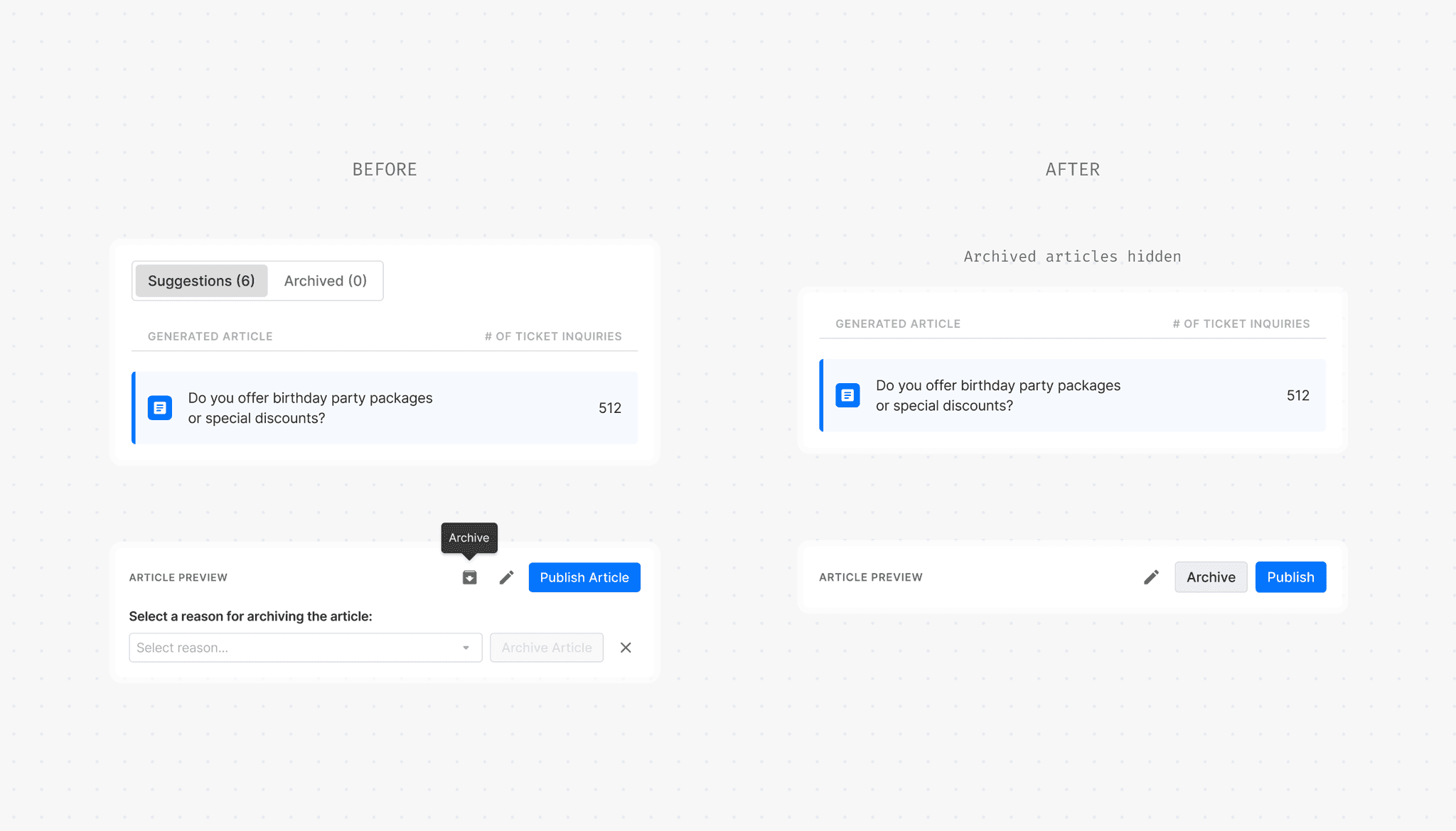 We replaced the archive icon with a text button for clarity and removed the archived articles from the front-end. Agents expressed that irrelevant articles were unlikely to be relevant in the future if resurfaced.