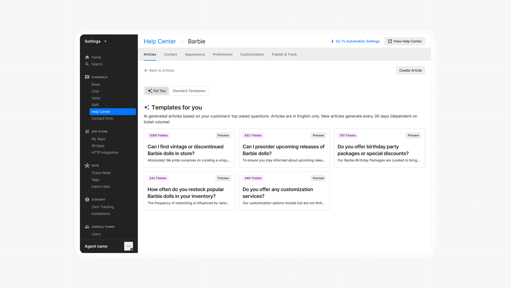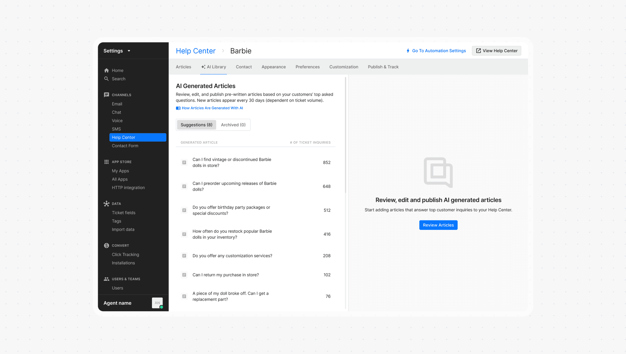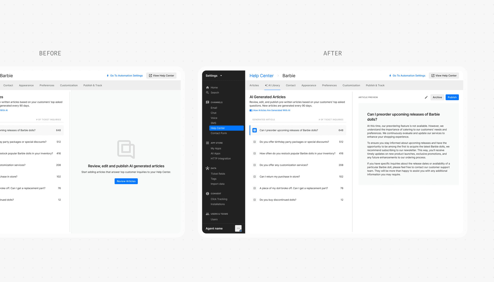 A new space in Help Center settings where merchants can access all their AI-generated articles. No more hunting through half-baked templates or starting from scratch.