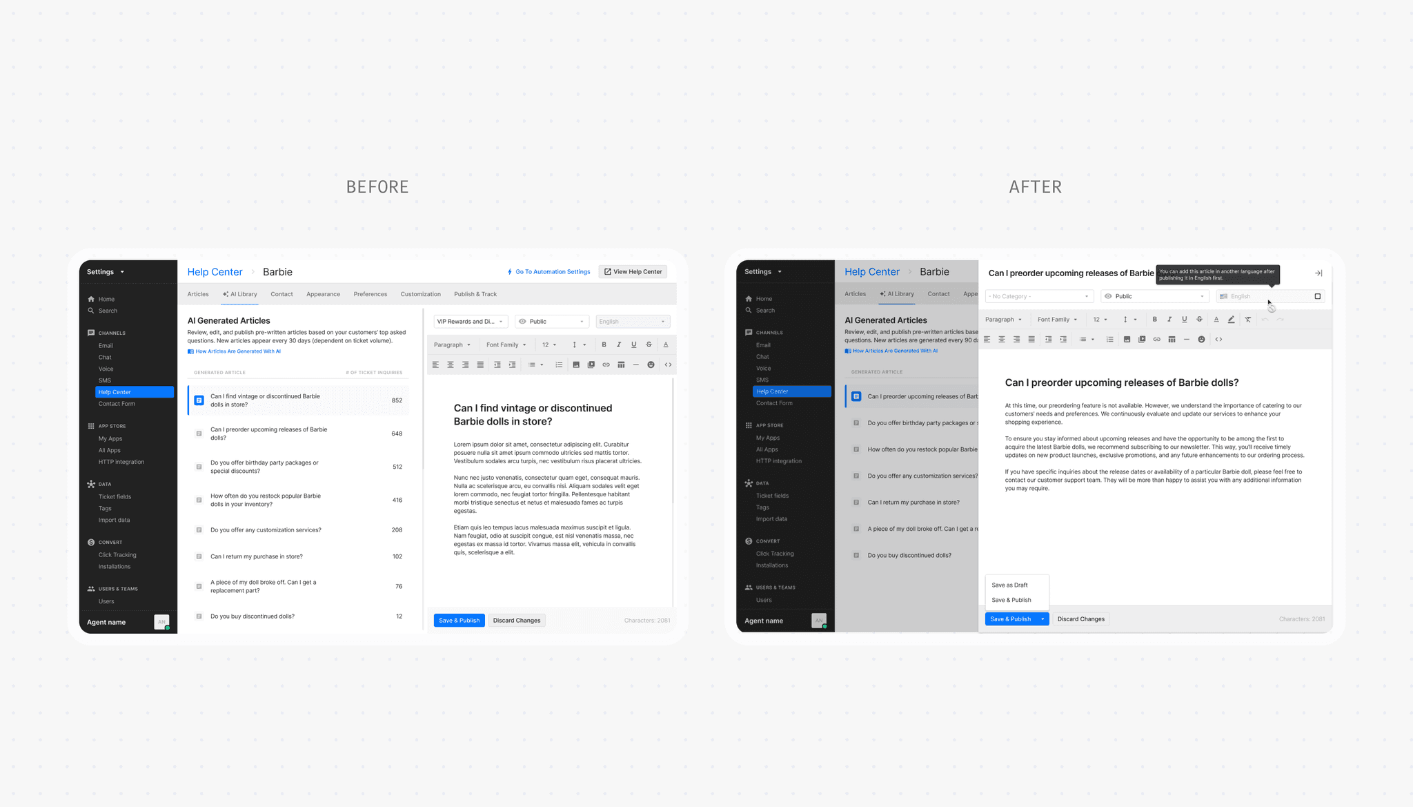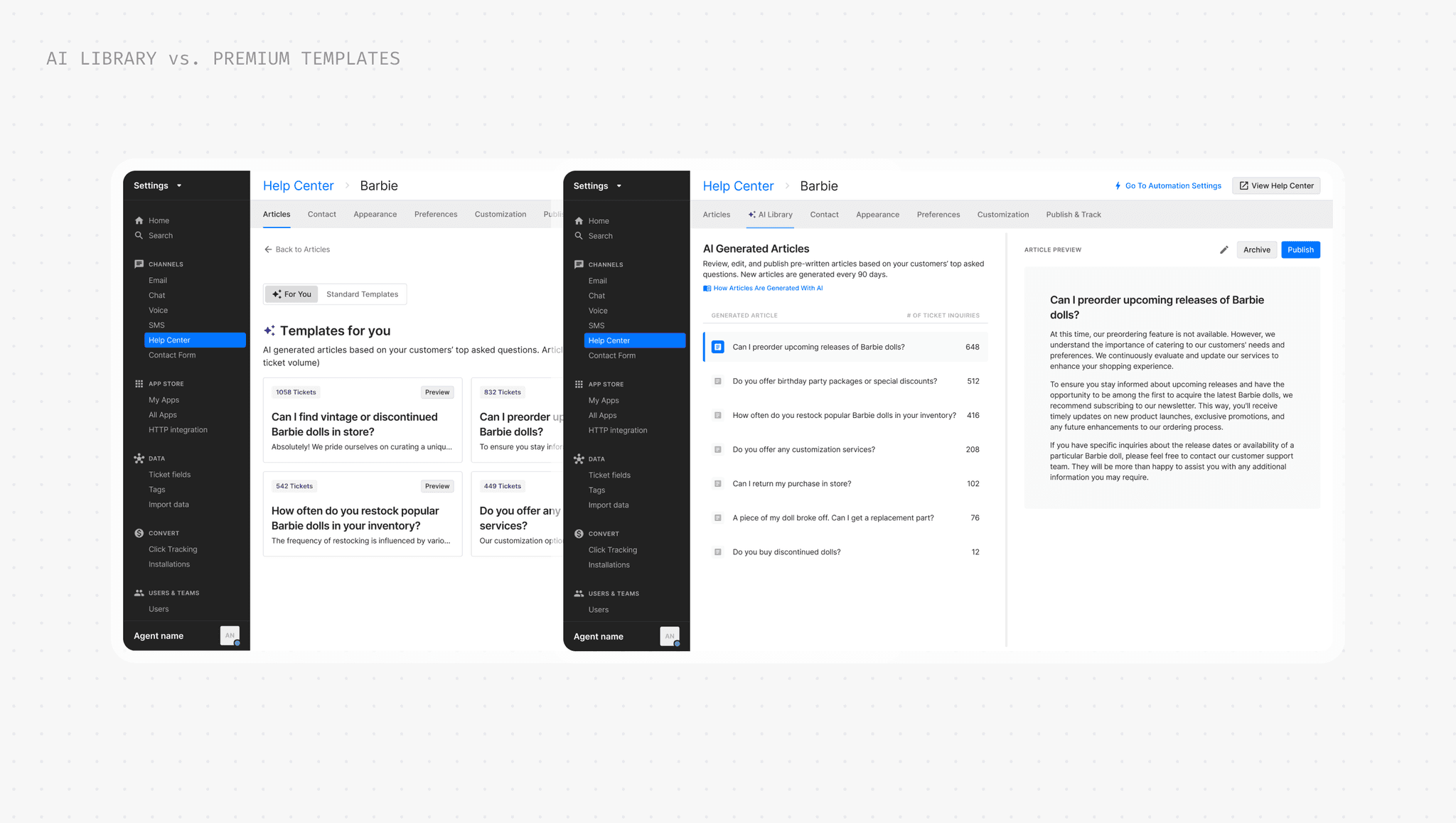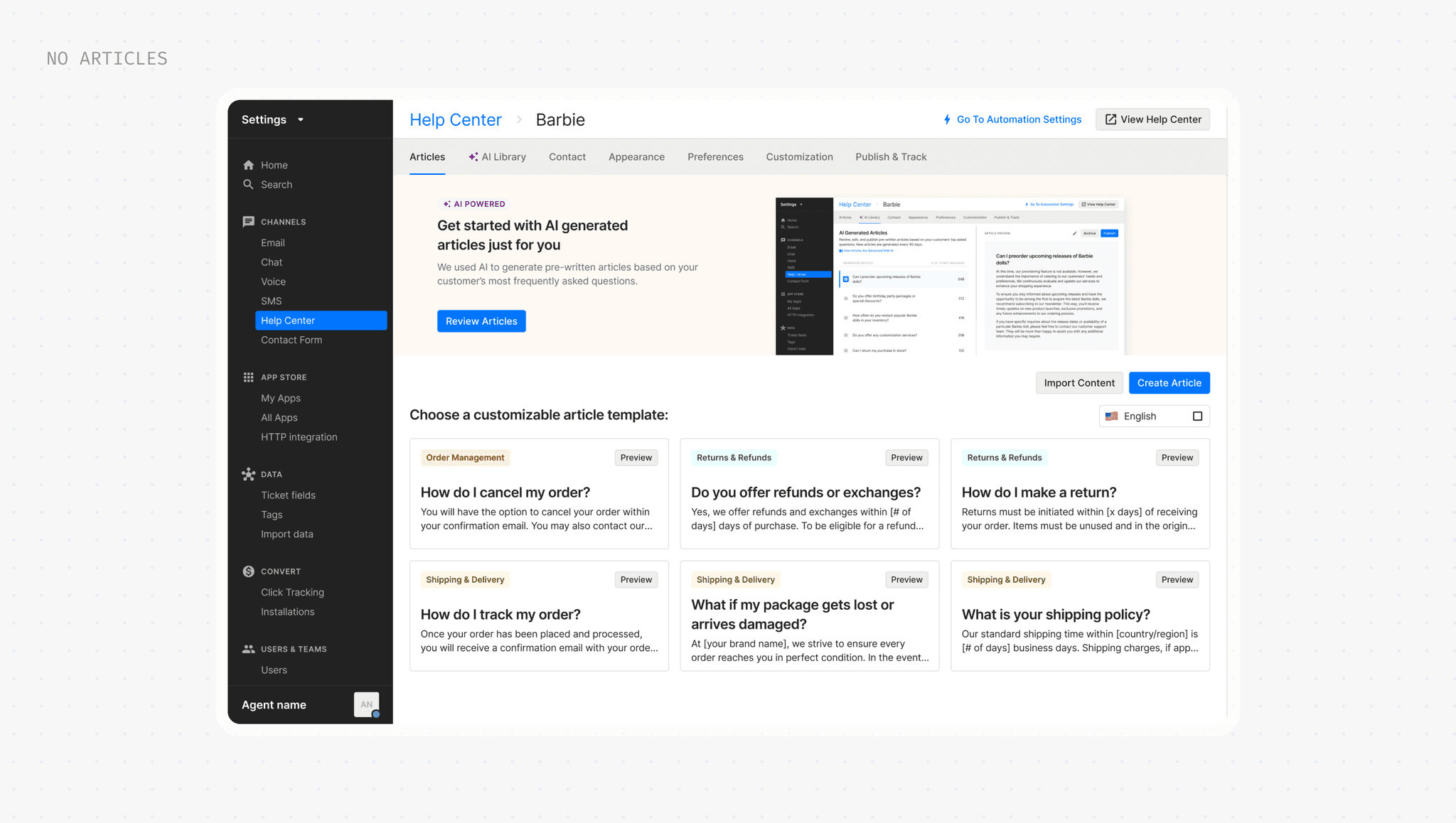 A new space in Help Center settings where merchants can access all their AI-generated articles. No more hunting through half-baked templates or starting from scratch.