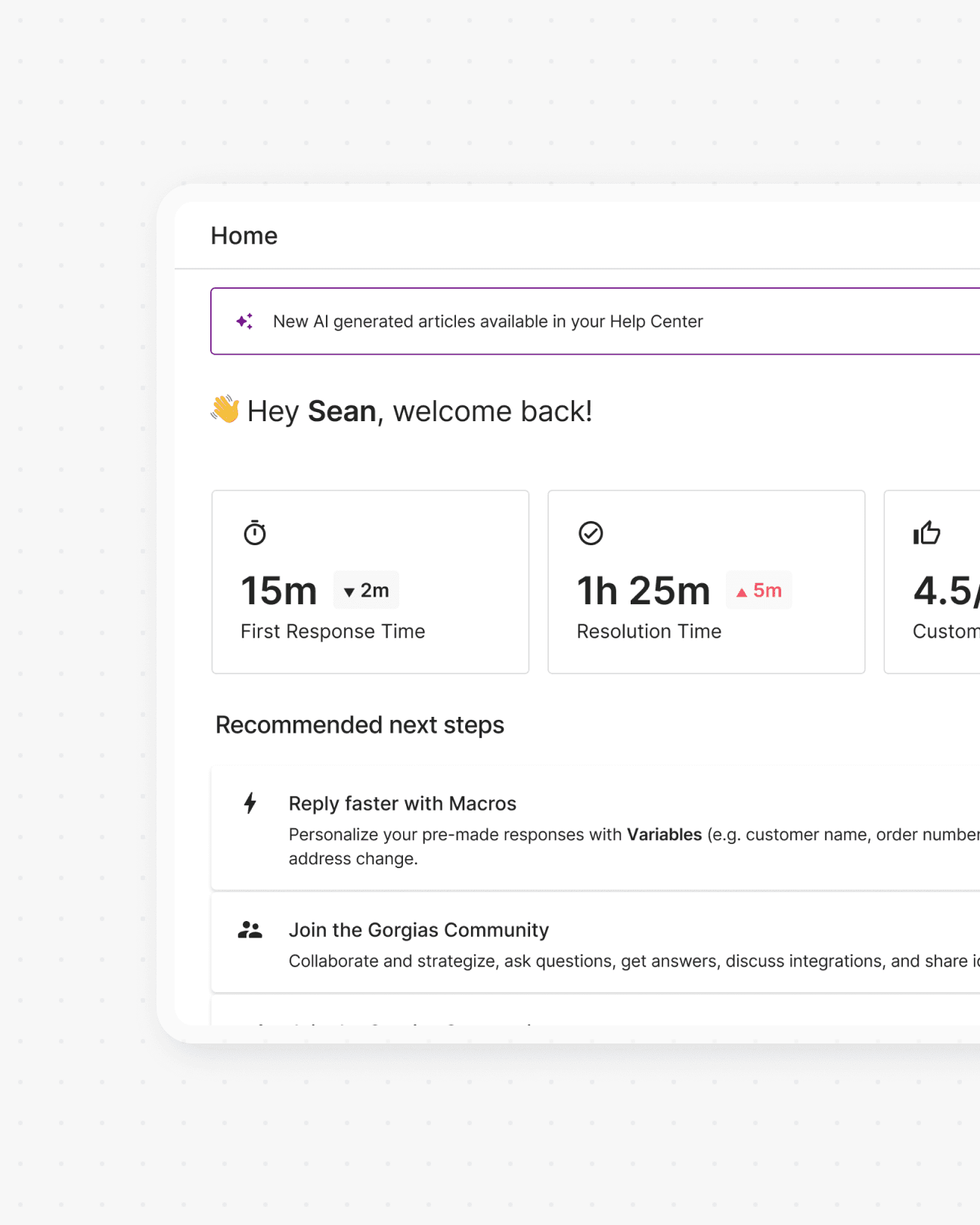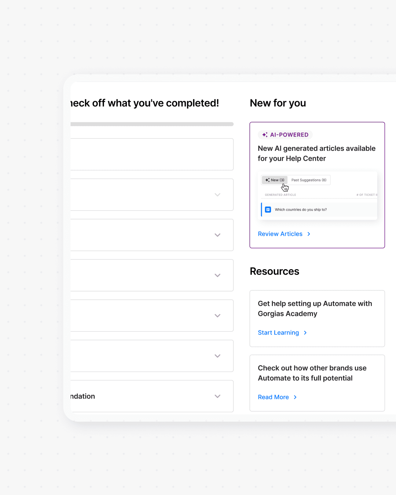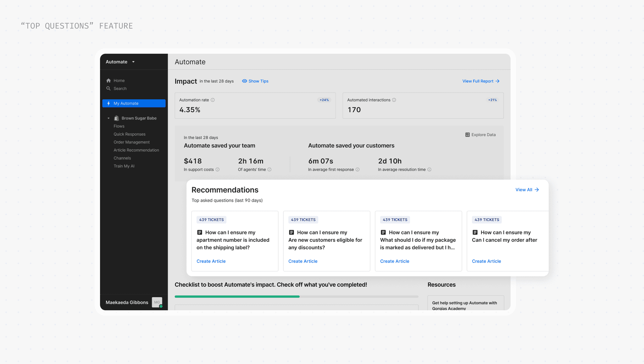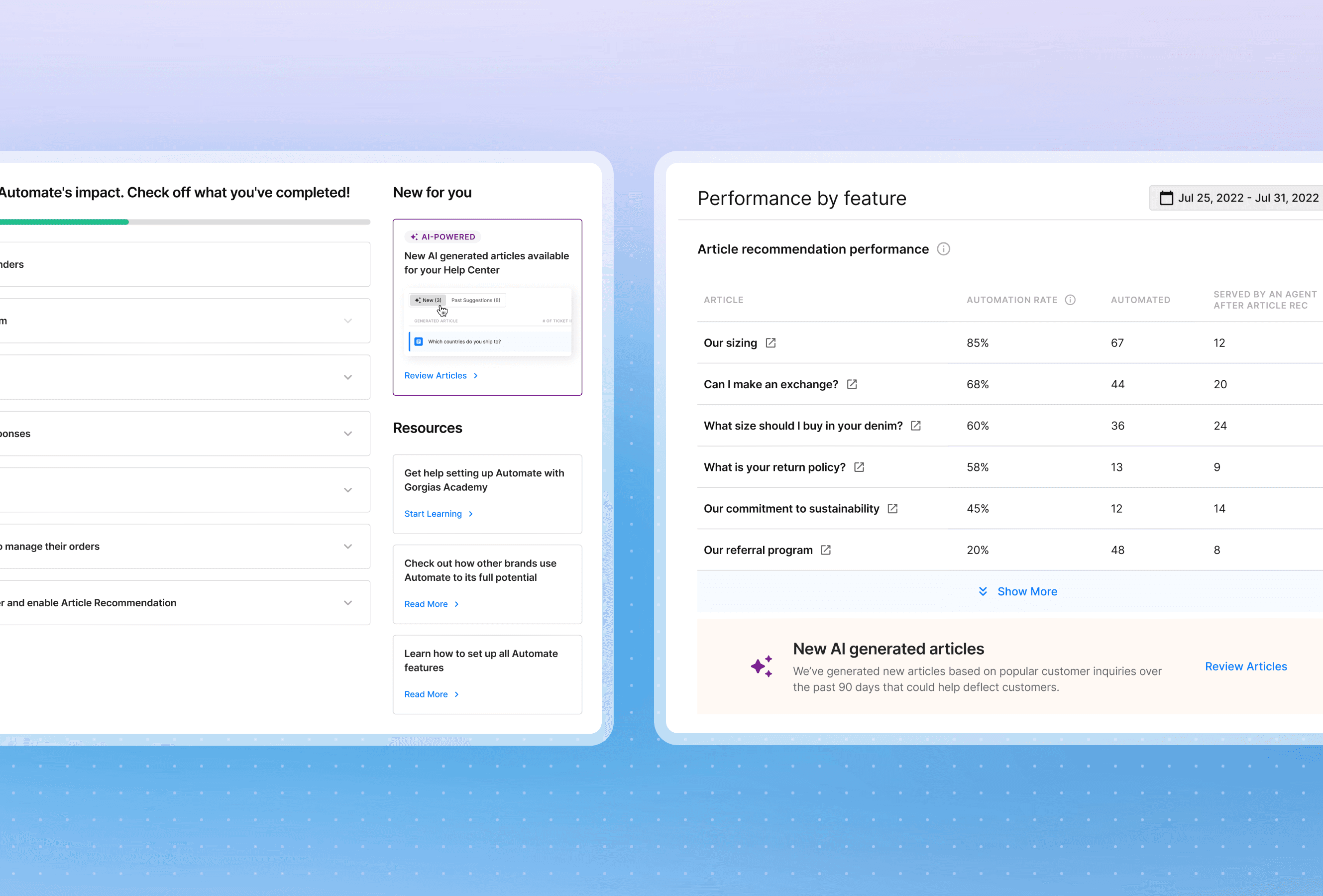 Since merchants infrequently manage their Help Center, we surface new AI articles in high-traffic areas like their analytics, homepage, automation dashboard, and via email.