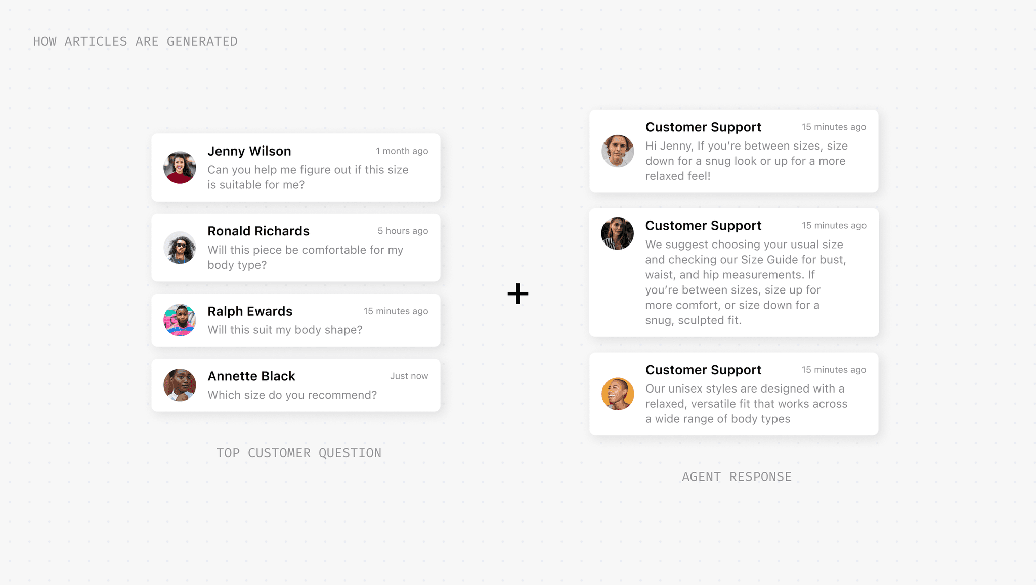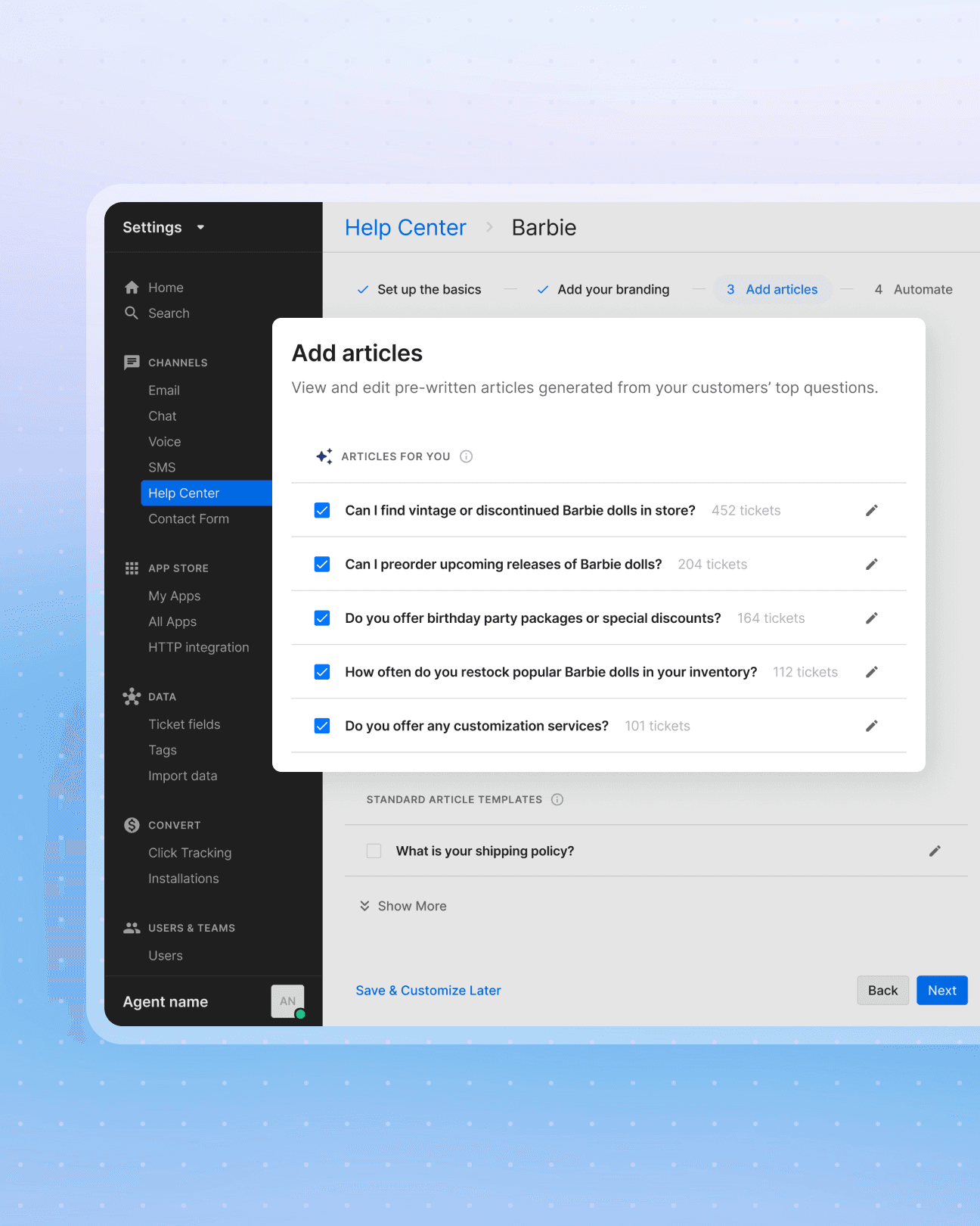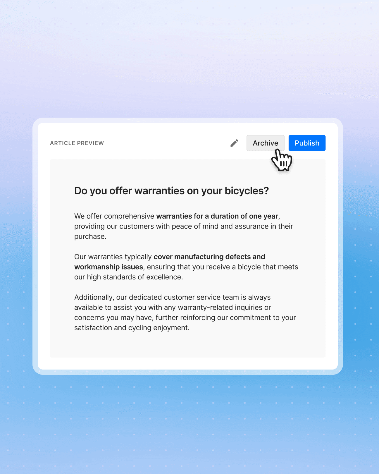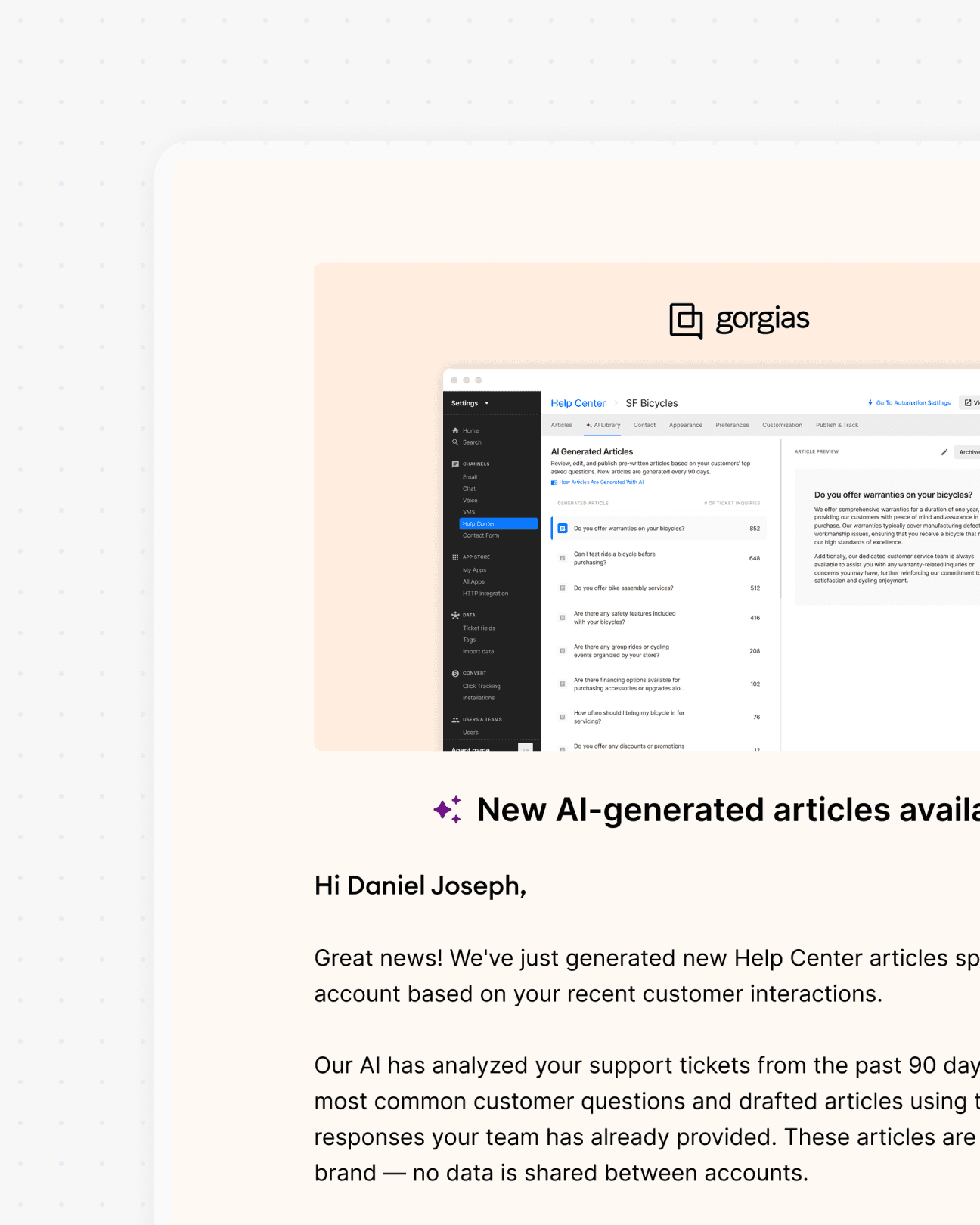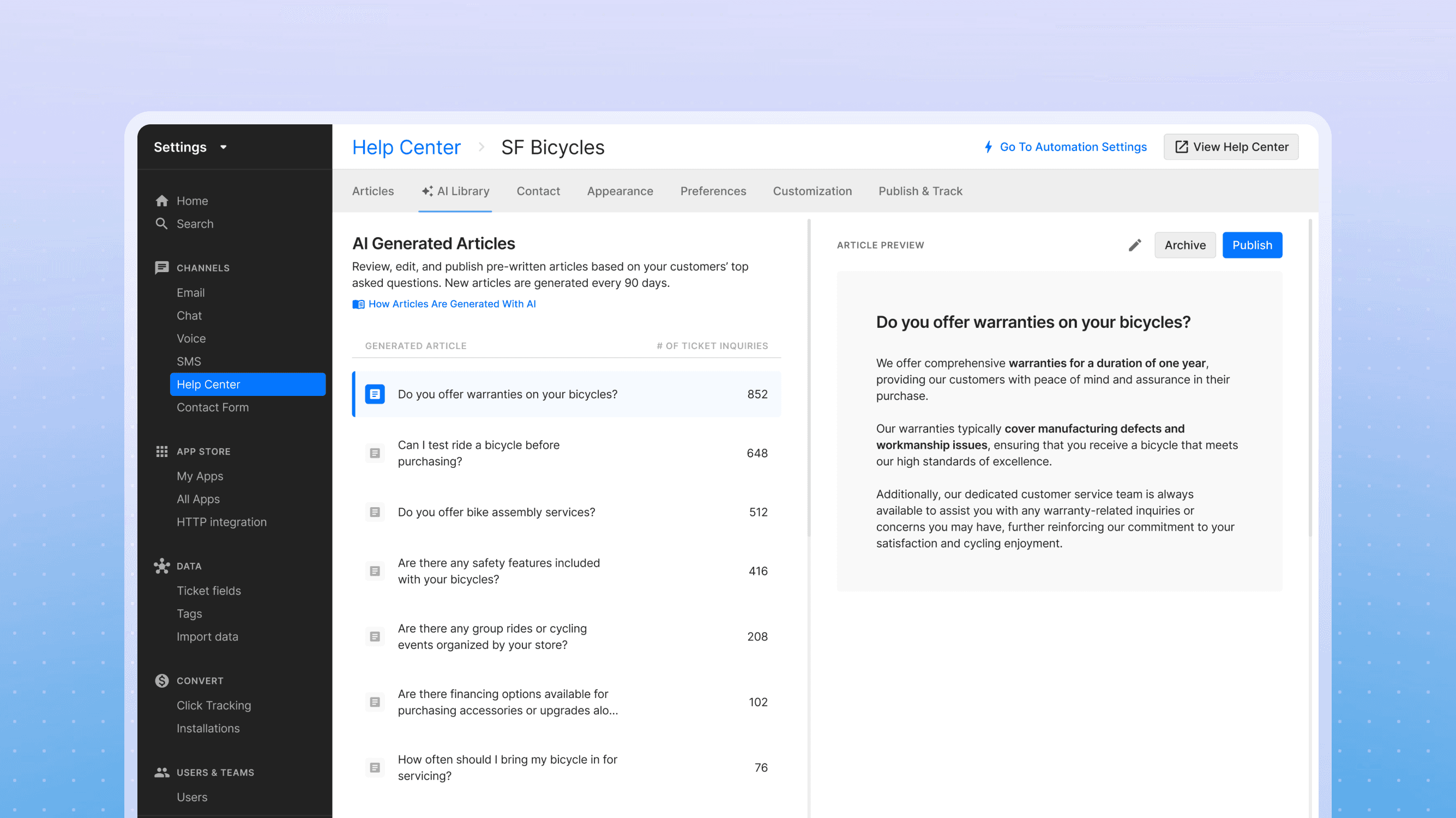 Articles are generated by analyzing a merchant's support history—identifying frequent questions and drafting content based on how their agents actually respond.