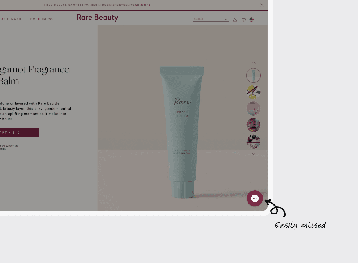 Shopping Assistant is tucked away in the chat widget, competing with product-related content that's far more visually engaging and relevant.