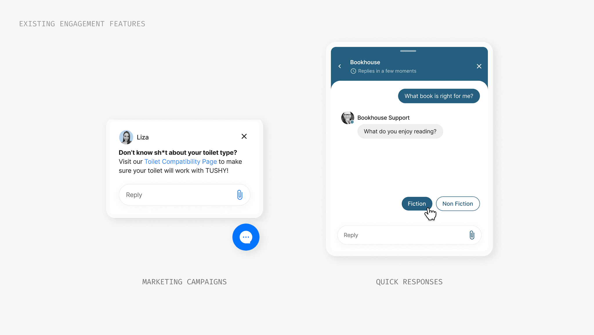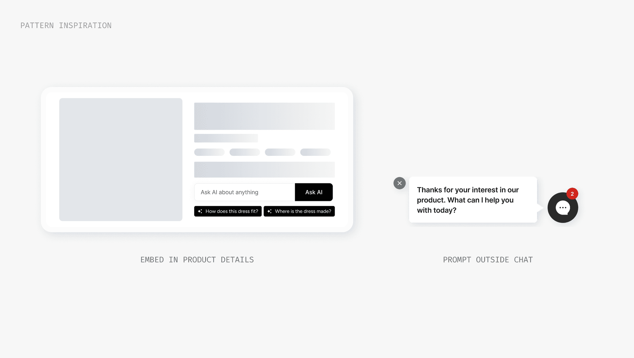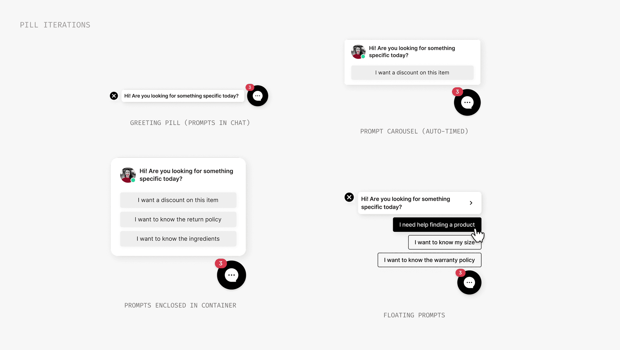 With a short turnaround, we explored common engagement patterns we'd seen from research: embedding questions directly in the page content or displaying them as floating pills outside the chat after a few seconds of lingering.